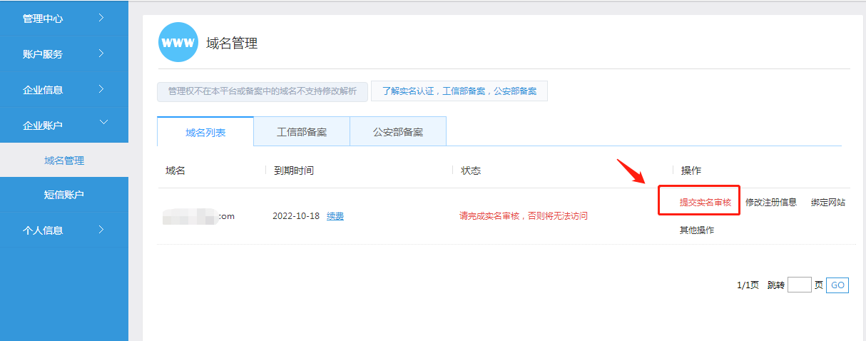 實名審核提交入口: 登錄【企業中心】--【企業賬戶】--【域名管理(lǐ)】
