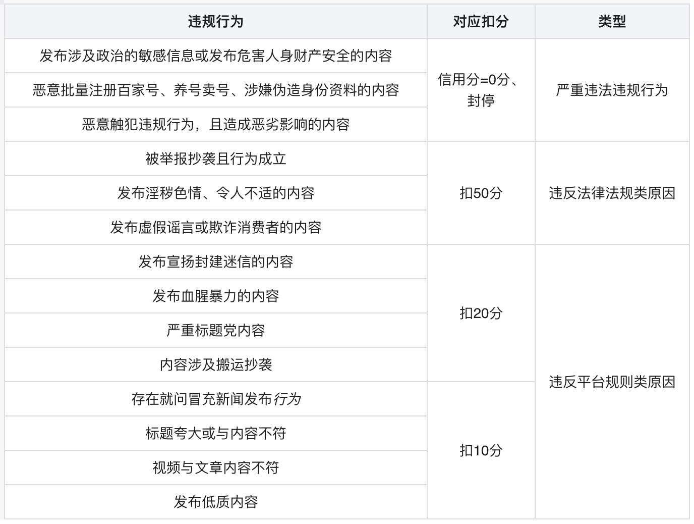 如(rú)果創作(zuò)者出現了以上這些違規行爲,将會被百家号扣除信用分(fēn)。